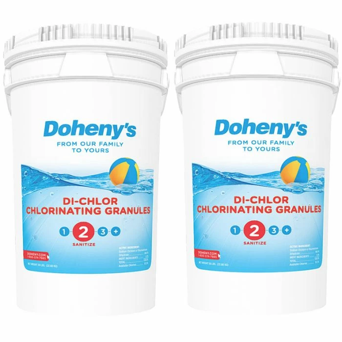 Doheny’s Di-Chlor granular chlorine features 56% available chlorine to destroy bacteria in a hurry and it’s calcium free, so there’s no need to worry about clouding. Doheny’s Di-Chlor granular chlorine should not be used in a daily chlorinator. If your chlorine level is low, use Di-Chlor to quickly raise the chlorine level without raising the pH level in the pool.