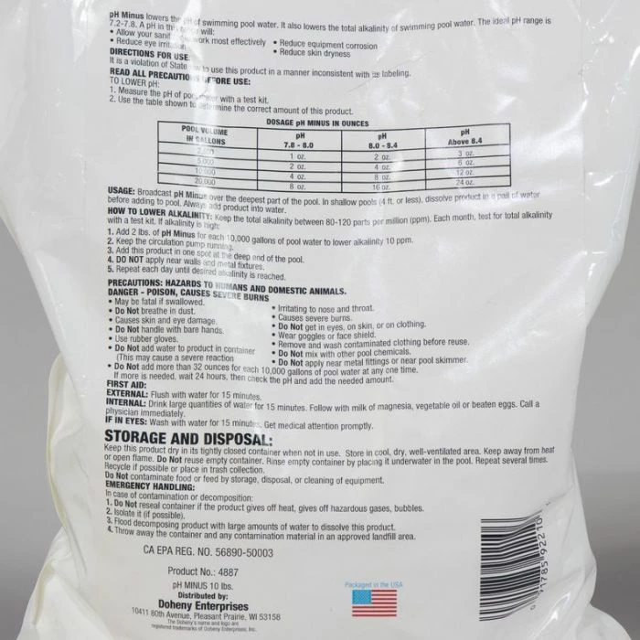 Lowers pH levels to prevent scaling and cloudy water – Ideal range 7.2 to 7.8. Keep on hand to treat elevated pH levels that can cause eye/skin irritation, cloudy water and scaling that can damage pool surfaces and equipment. Made in the USA!