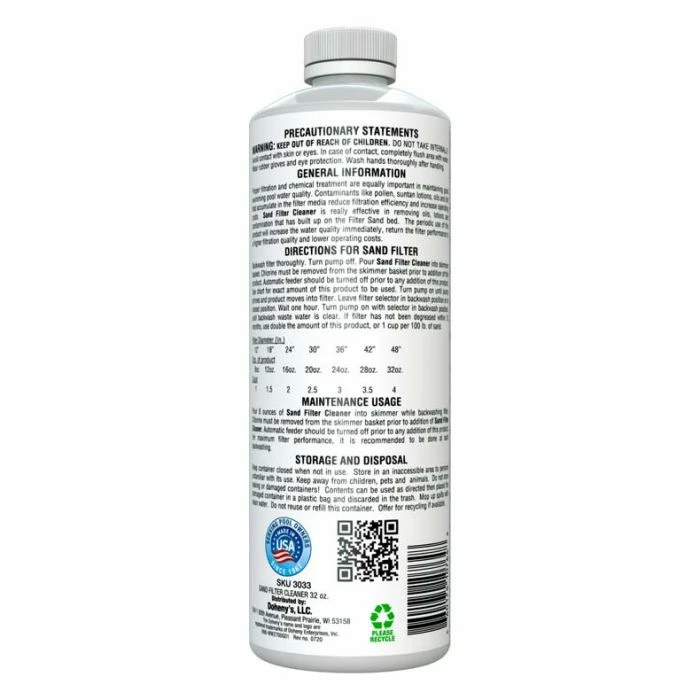 Dohenys Sand Filter Cleaner is really effective in removing sand from the filter and its elements, keeping your filter operating efficiently. The periodic use of Dohenys Sand Filter Cleaner will also help maintain good swimming pool water quality with proper filtration and chemical treatment of the sand collected in the filter. It promotes better filtration, lengthens filter cycles and reduces maintenance costs.