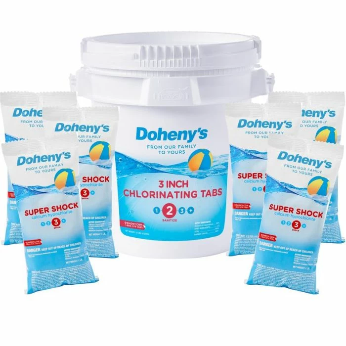 For safety and convenience, Doheny’s 3-inch chlorine tablets are shipped in a locked, easy-open bucket, the best in the industry. Spend up to 50% less than competitors with Doheny’s fresh, pure, uncontaminated pool chlorine tabs at a volume discount price.