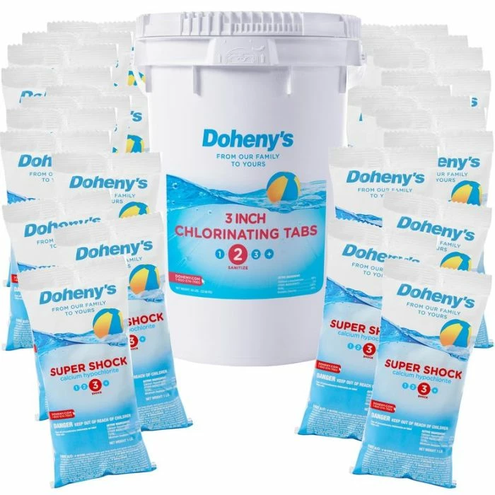 For safety and convenience, Doheny’s 3-inch chlorine tablets are shipped in a locked, easy-open bucket, the best in the industry. Spend up to 50% less than competitors with Doheny’s fresh, pure, uncontaminated pool chlorine tabs at a volume discount price.