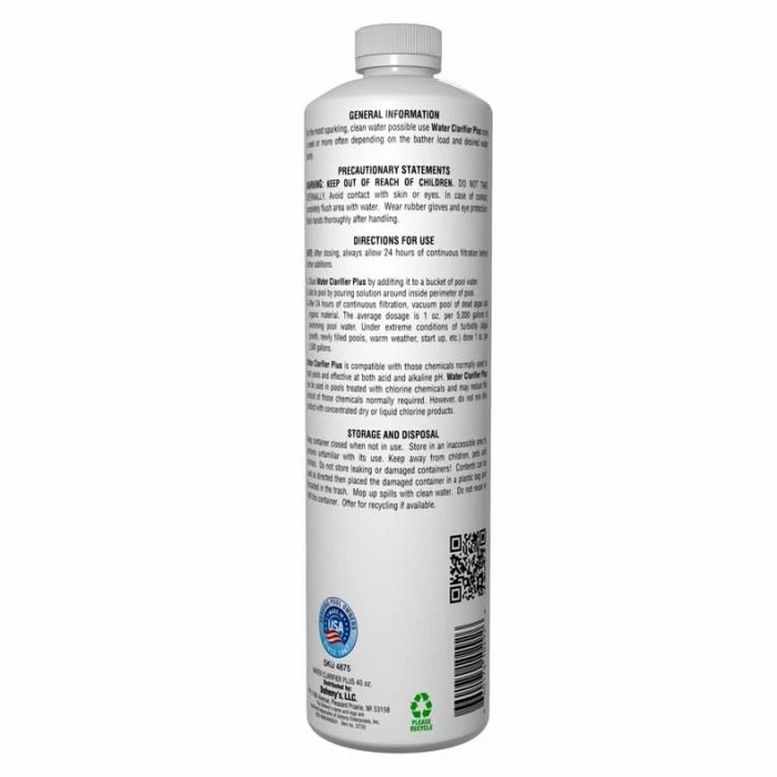 Pool water clarifiers help remove tiny suspended particles that can escape the filtration system. Our Water Clarifier Plus binds together tiny particles that escape the filtration system so they’re large enough to be trapped! You’re left with sparkling clear pool water! Quick dosage measuring with see-through measuring strip on bottle. Bottles are poly-bagged and feature child-resistant caps. Not for use with DE filters.