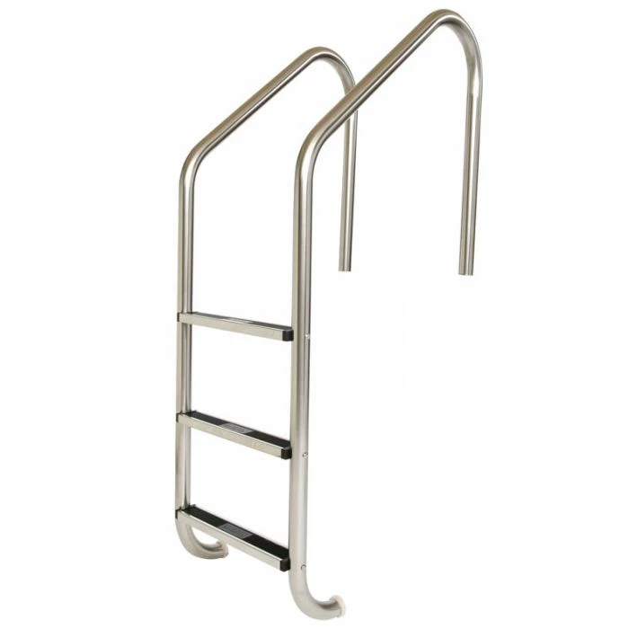 Sturdy frames made of 1.90 O.D. x .065 in. wall 304 stainless steel tube with mirror finish. All bends are 6 in. radius. Frames extend 6.5 in. from pool wall. Upper ends of frames fasten to pool deck with two anchor sockets on 20 in. centers. Lower ends of ladder frames are bent to meet pool wall and fitted with two white rubber bumpers.